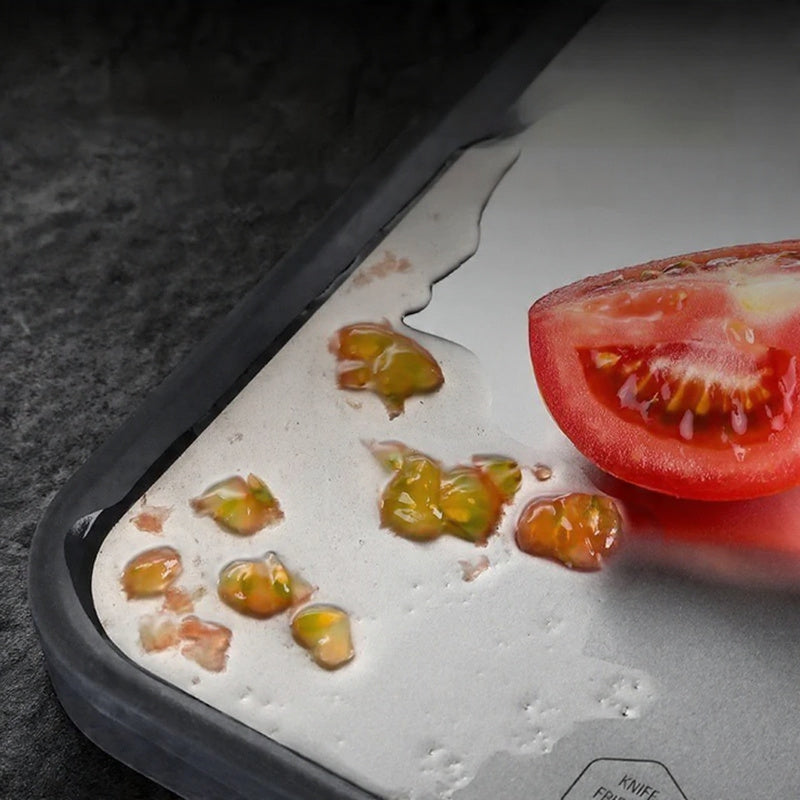 A dual-surface cutting board with stainless steel on one side and marble-pattern PP on the other. Hygienic, anti-slip, and easy to clean perfect for meat, fish, or vegetables. Comes with a free knife sharpener for daily kitchen use.